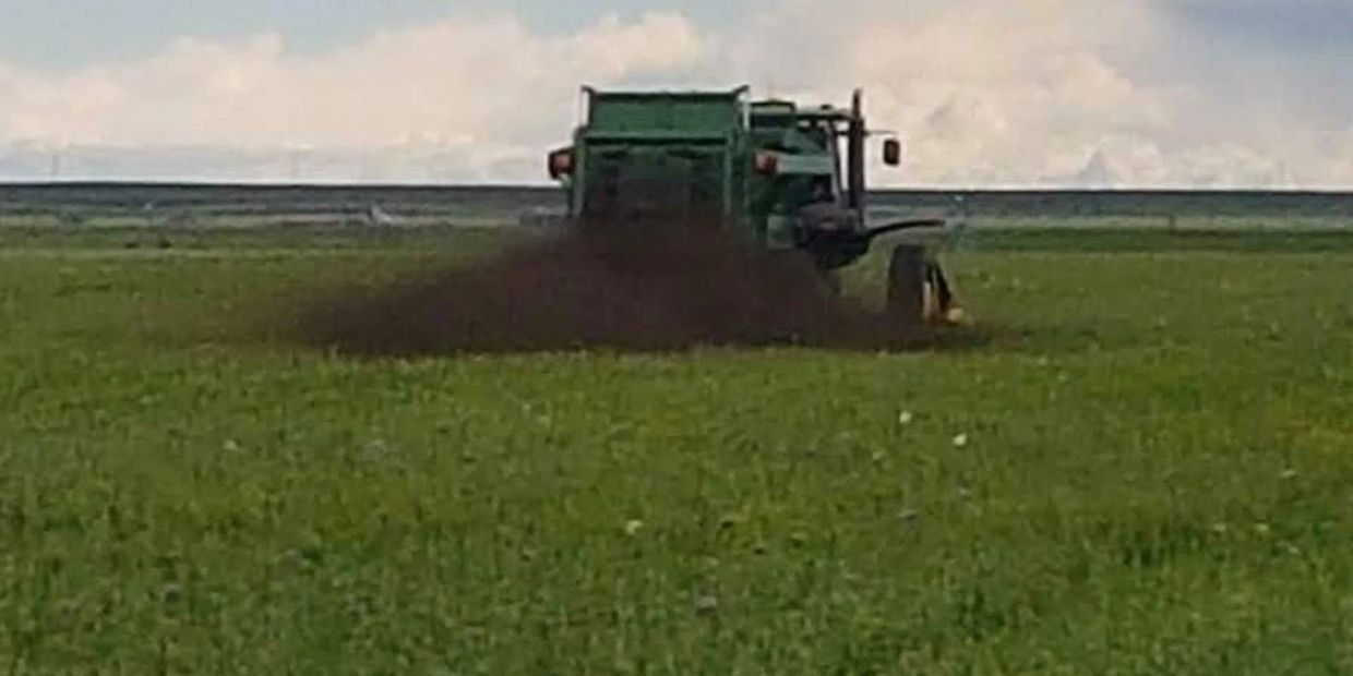 We make and spread our own compost using feedlot manure. This adds biology, nutrients, and carbon to our soil.